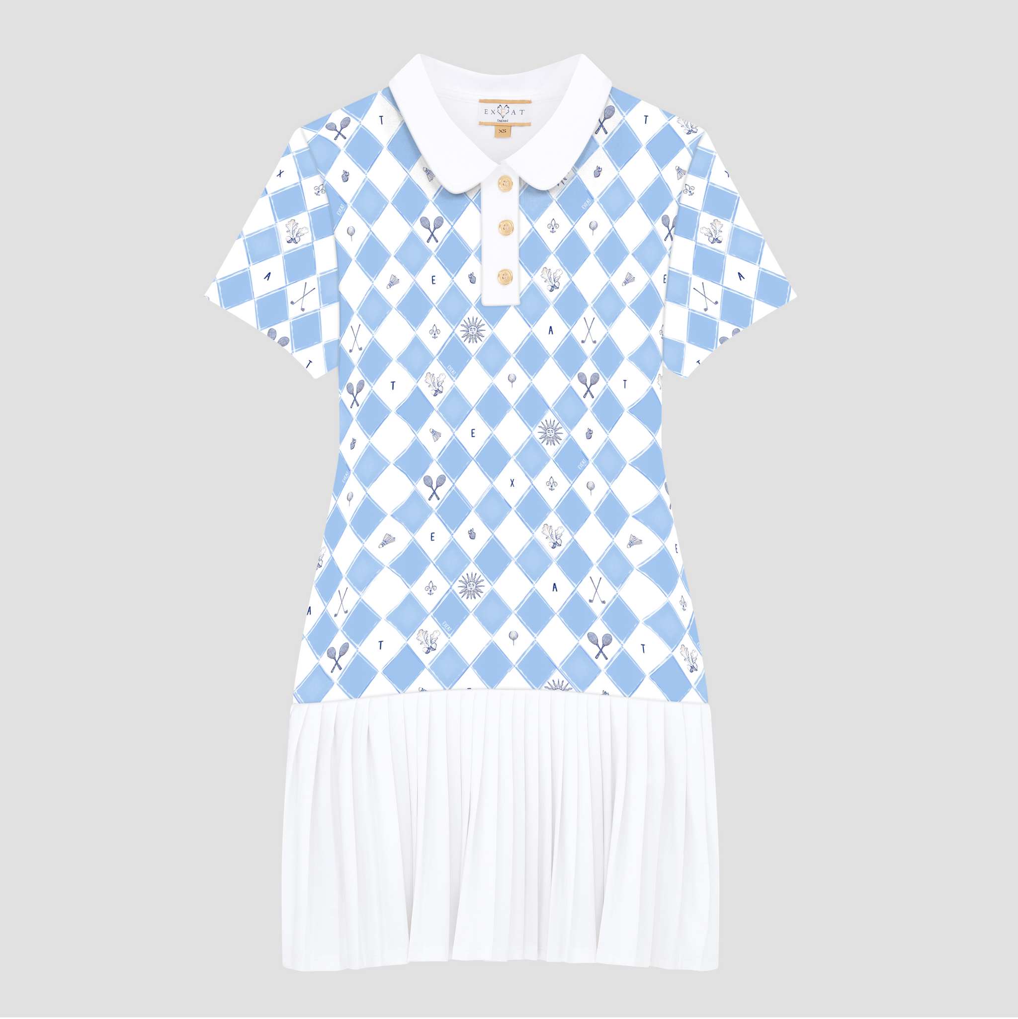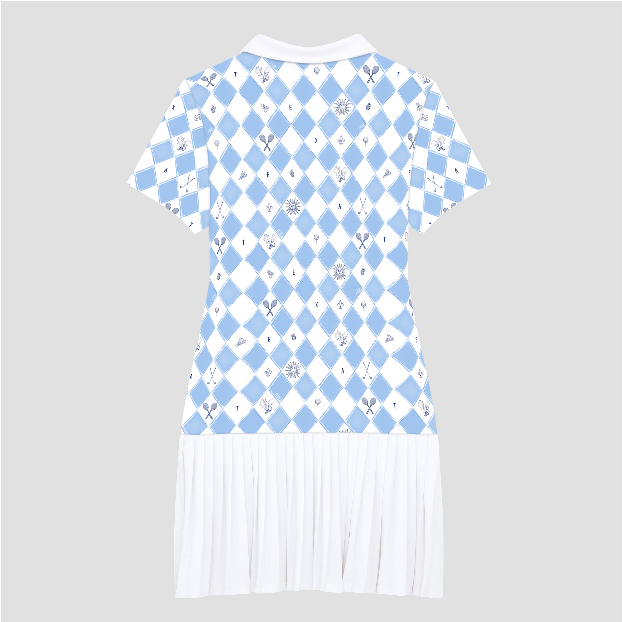 The quintessential lawn tennis dress that's an instant icon on court. Featuring classic Argyle diamonds playfully scattered with illustrated tennis racquets, golf clubs, fleur de lis and oak leaves, this deeply flattering ball gown is spun from butter soft sustainable fabric that's a dream to move in & wafts beautifully across the body. An elegantly feminine Peter Pan collar elongates the neck & is set-off by a dazzling trio of over-sized golden buttons. At the skirt, our signature razor sharp Power Pleats seal the deal, bestowing sleek fluidity upon hips, bottoms & thighs. Truly, it's the perfect tennis dress.