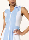 Our iconic figure loving azure blue & fresh white tennis dress brings all the drama to court. Ingenious optical panels sculpt the silhouette whilst the high'n'wide waistband is your secret weapon, comfortably supporting the waist and tum during play. An ultra-short hem cut elongates legs and playfully reveals ball shorts beneath.